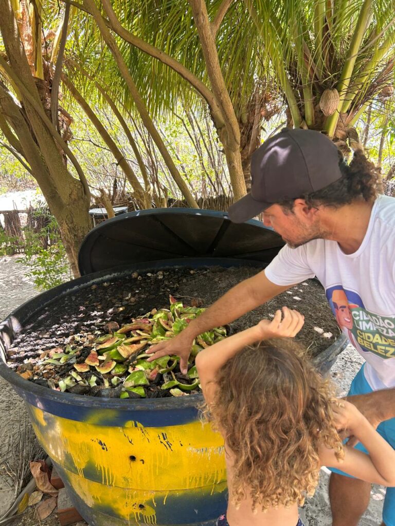 O guia Jamerson, com o filho Francisco, explica o funcionamento do escambo e da compostagem aproveitando sobras de alimentos verdes