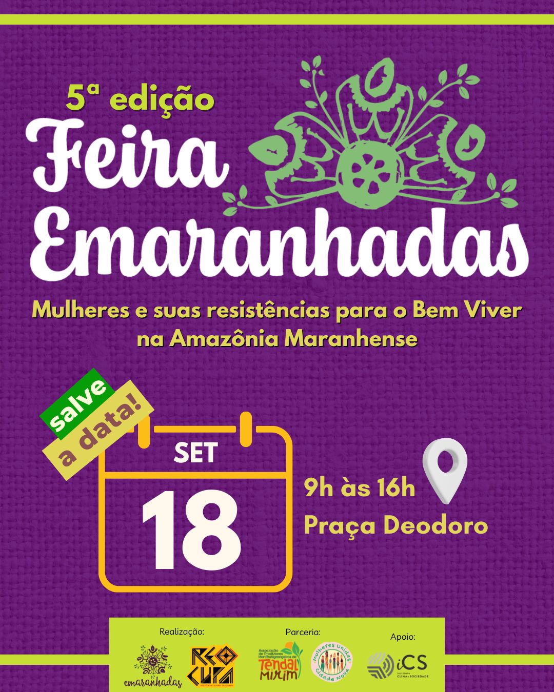 A Feira Emaranhadas é uma realização da Rede Emaranhadas, com apoio do Instituto Clima e Sociedade (iCS), em parceria com o Coletivo Reocupa e colaboração da Associação Comunitária de Produtores e Hortifrutigranjeiros de Tendal Mirim e do Grupo Mulheres Unidas Cidade Nova.